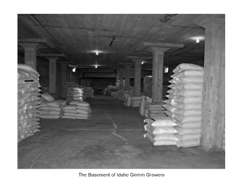 In 1929, the original building was demolished by fire and the existing building was built in 1930. The new building structure was engineered to be fireproof and has proved its solidity for over 80 years. Throughout the 1930's Idaho Grimm Growers employed over 50 employees at a time because the bags of seed weighed 30 to 160 pounds and were moved by hand.